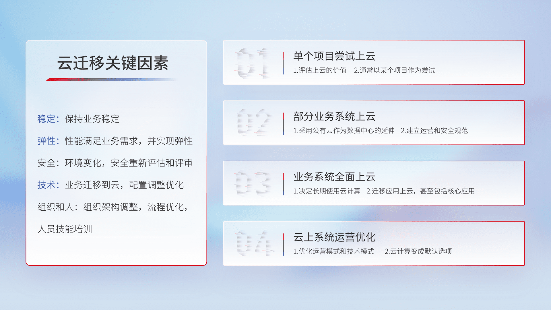 结合实际业务,,,,从规划设计、、、云平台选型、、、、云原生改造、、数据迁移、、集成交付,,迁移全过程为客户识别最佳上云路径,,,,做好风险识别管理,,,,设计网络架构、、、身份权限、、安全审计合规、、、、操作审计、、日志审计、、监控告警策略、、、多站点容灾设计等,,,,对云上基础设施进行整体规划,,提升IT治理水平,,,以满足弹性、、、、高可用、、、、高性能的需求。。。