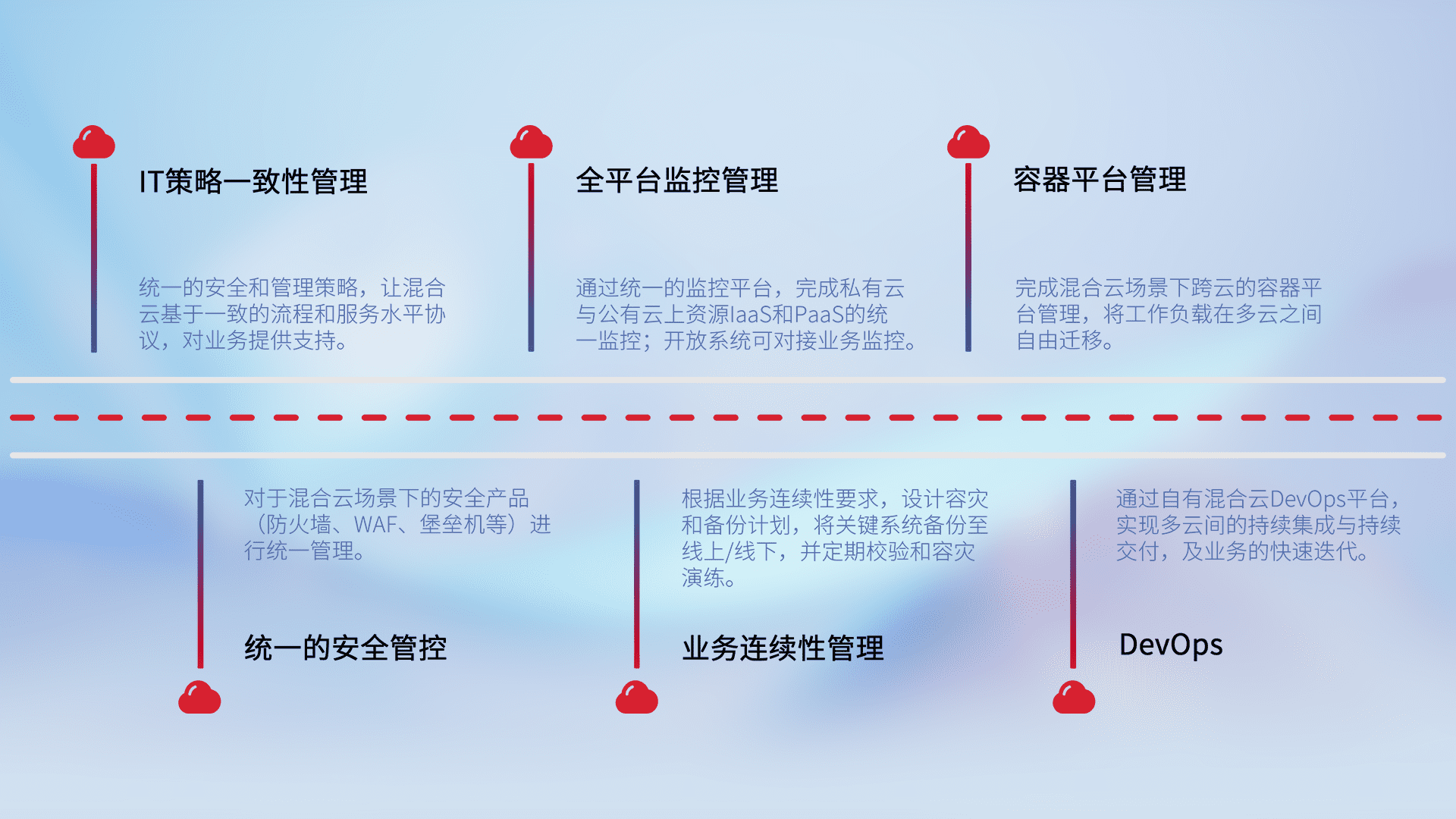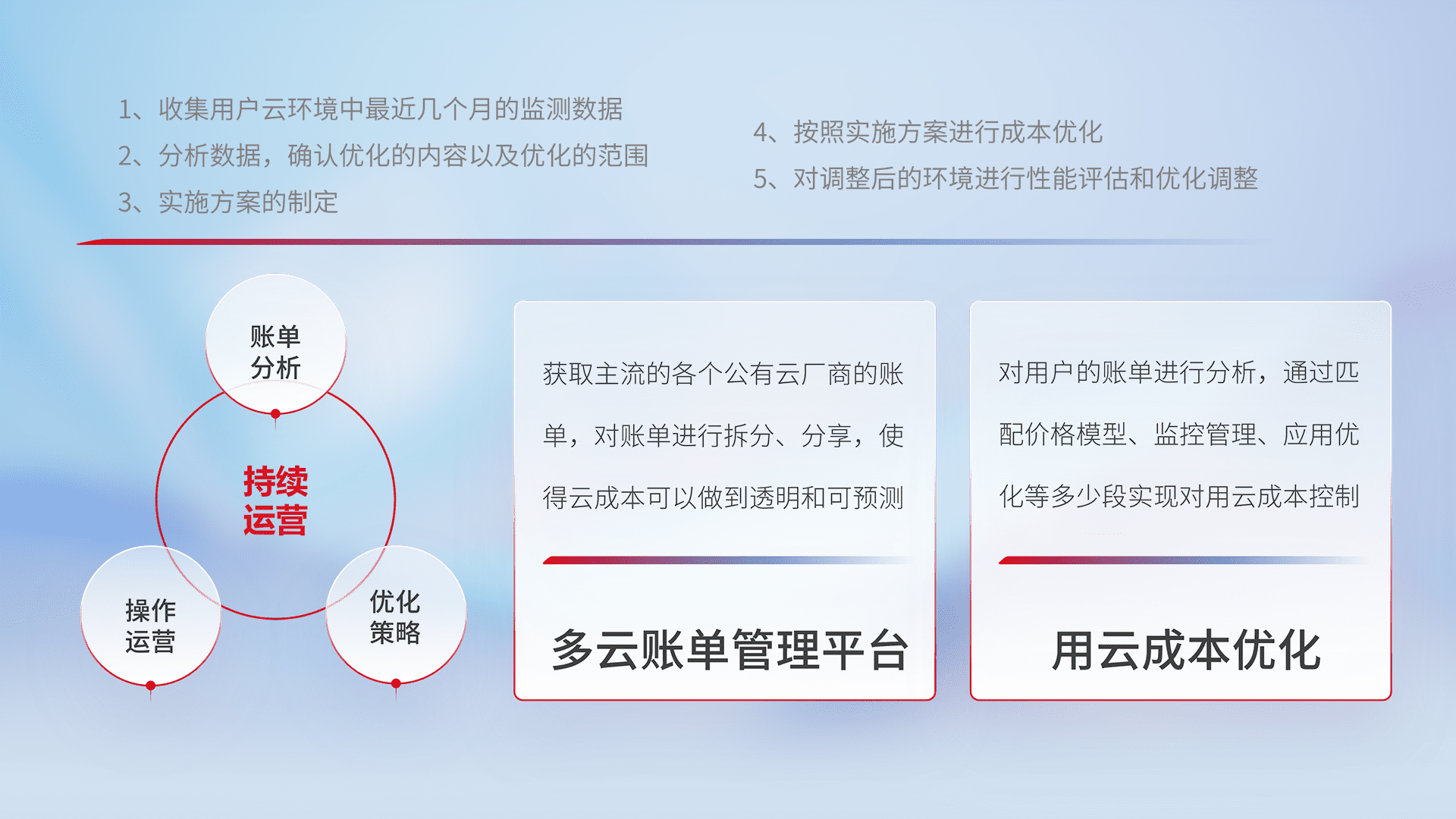通过多云纳管,,,,以统一的资源数据模型把客户的云资源进行抽象和封装,,,,进而实现对多云资源的统一操作,,保障云资源管理的可靠性、、稳定性与可用性。。。量身定制化运维内容,,,配置、、开发运维、、、补丁管理、、、、备份、、监控、、、认证和访问管理、、、审计和日常巡检等,,保障在用云过程中的可靠度,,,,稳定度以及高可用率。。。。