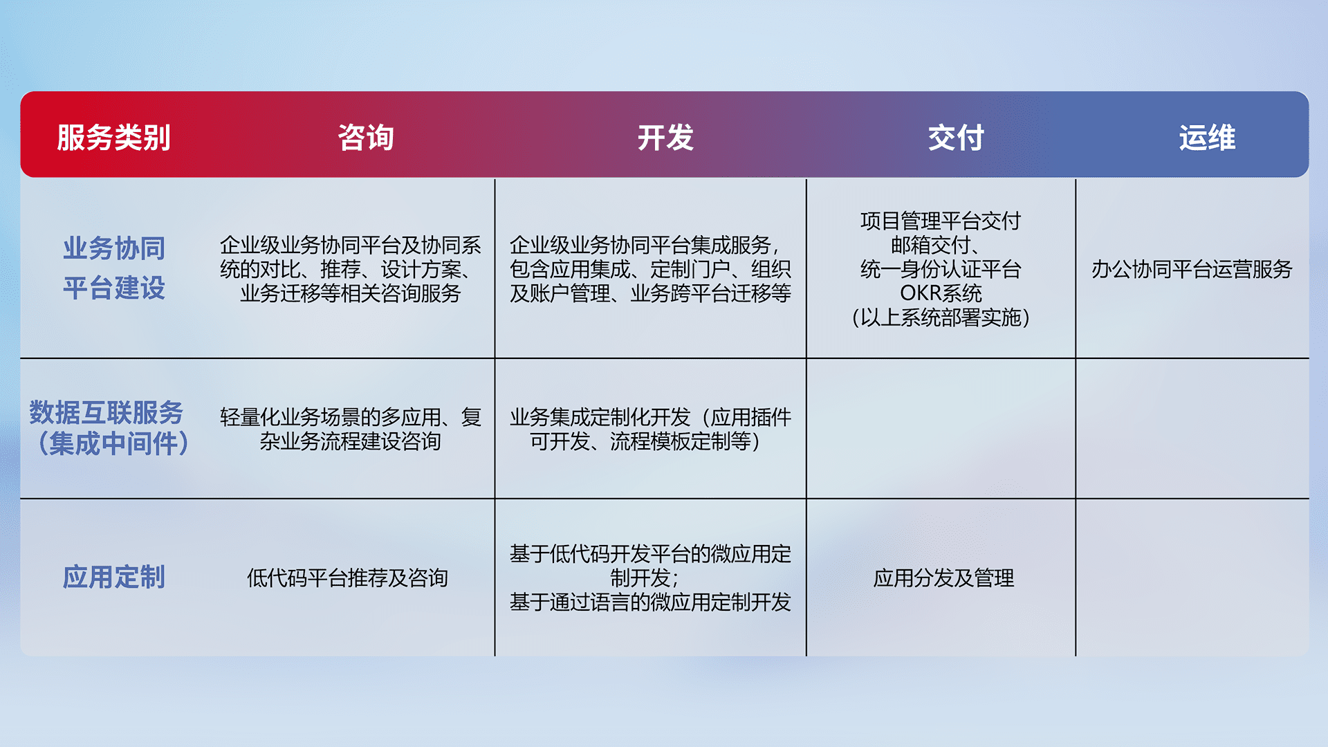 针对钉钉、、企微、、IDaas等平台级产品提供产品的规划、、、方案、、、交付、、、、定制化开发等服务,,,实现如统一协同办公、、、、智能客户服务、、、、混合会议管理、、、、智能数据查询、、、、等业务场景,,实现数字化转型。。。